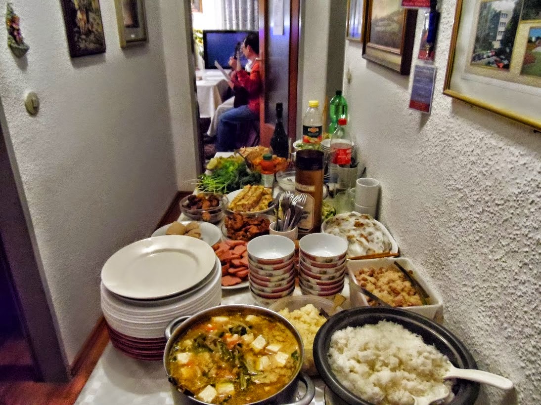 Sau khi tham dự bàn tiệc Thánh, chúng tôi cùng nhau tham dự bàn tiệc rượu do mỗi ACE đưa đến. Nhìn bàn ăn không thiếu món nào. Từ mứt, kẹo đậu phụng, bánh chuối hấp nước dừa, bánh khoai mì, bánh chưng, bánh ít, xôi, giò, chả, nem nướng, bánh cuốn, thịt gà kho gừng, thịt heo kho trứng với dưa muối, mắm chưng với trứng, canh đậu hủ…các loại trái cây v.v... hương vị ngày Tết là đây.